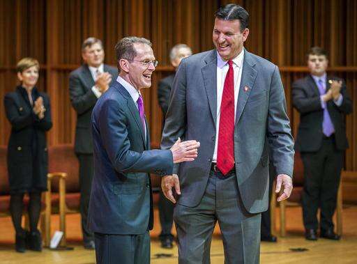 Ball State's seventeenth president, Geoffrey Mearns, is introduced by board chair Rick Hall during a public trustees meeting at Sursa Hall on the Muncie, Ind., campus Tuesday, Jan. 24, 2017. Ball State University trustees voted Tuesday to hire its new president away from Northern Kentucky University, a year after the school's previous leader resigned without explanation. Ball State's board voted unanimously to select Mearns, who has been Northern Kentucky's president since 2012. (Jordan Kartholl /The Star Press via AP) The Associated Press