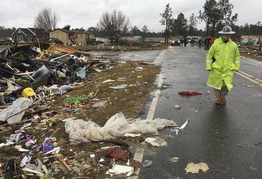 ADDS DATE - A Georgia state trooper walks past a mobile home destroyed by severe weather in Adel, Ga., Monday, Jan. 23, 2017. Gov. Nathan Deal declared a state of emergency in several counties, including Cook, that have suffered deaths, injuries and severe damage from weekend storms and expanded it Monday to include additional counties in southern Georgia. (AP Photo/Brendan Farrington) The Associated Press