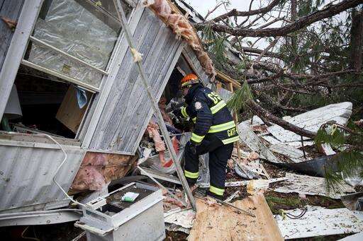 A rescue worker enters a hole in the back of a mobile home Monday, Jan. 23, 2017, in Big Pine Estates that was damaged by a tornado, in Albany, Ga. Fire and rescue crews were searching through the debris, looking for people who might have become trapped when the deadly storm came through. (AP Photo/Branden Camp) The Associated Press