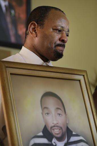 Civil rights activist Najee Ali bites his lips while holding a portrait of Ezell Ford at a news conference Tuesday, Jan. 24, 2017, in Los Angeles. Two Los Angeles police officers acted in self-defense when they fatally shot the 25-year-old black man during a struggle over an officer's gun and will not face criminal charges for the 2014 shooting that led to protests, prosecutors said Tuesday. (AP Photo/Jae C. Hong) The Associated Press