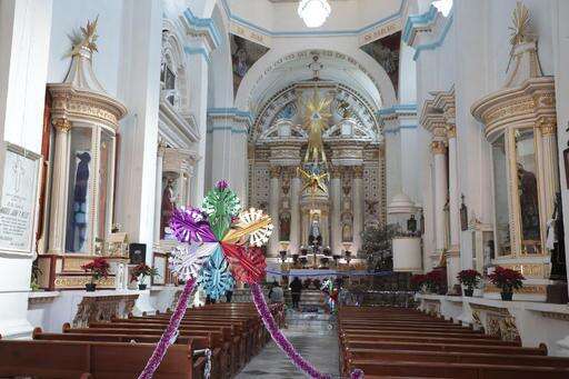 This Dec. 23, 2016 photo shows the inside of the church in Molcaxac, Puebla state, Mexico. An estimated 95 percent of families in Molcaxac have relatives north of the border who send money to help pay for everything from home additions to start-up capital for a small businesses and a fireworks show at the annual town fair, according to municipal historian Oswaldo Lorenzo Cabrera Medel. (AP Photo/Pablo Spencer)