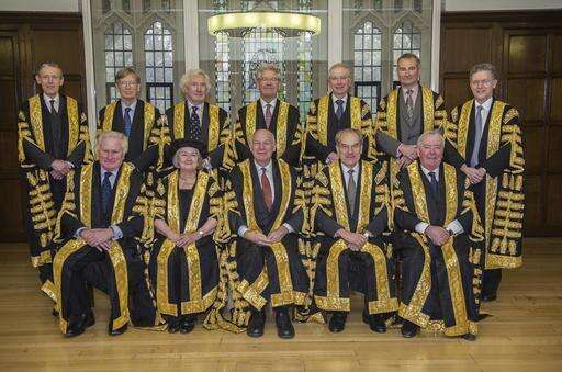This undated photo issued by the Supreme Court shows the Justices of the Supreme Court of the UK who will be sitting on the Article 50 case on Tuesday Jan. 24, 201. Back row from left, Lord Toulson - not sitting in the Article 50 case -, Lord Carnwath, Lord Sumption, Lord Wilson, Lord Reed, Lord Hughes, Lord Hodge and front row from left, Lord Kerr, Lady Hale, Lord Neuberger, Lord Mance, Lord Clarke. Britain's government must get parliamentary approval before starting the process of leaving the European Union, the Supreme Court ruled Tuesday Jan. 24, 2017, potentially delaying Prime Minister Theresa May's plans to trigger negotiations by the end of March. (Supreme Court via AP)