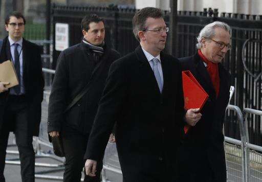 Britain's Attorney General Jeremy Wright, second right, arrives at the Supreme Court in London, Tuesday, Jan. 24, 2017. Britain's Supreme Court will rule Tuesday on whether the prime minister or Parliament has the right to trigger the process of taking Britain out of the European Union. (AP Photo/Frank Augstein)
