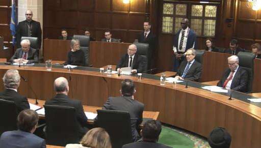 In this framegrab taken from the Supreme Court handout video, Lord Neuberger, President of the Supreme Court, center, speaks at Britain's Supreme Court in London, Tuesday Jan. 24, 2017, on whether the prime minister or Parliament has the right to trigger the process of taking Britain out of the EU. Britain's government must get parliamentary approval before starting the process of leaving the European Union, the Supreme Court ruled Tuesday, potentially delaying Prime Minister Theresa May's plans to trigger negotiations by the end of March. (Supreme Court via AP)