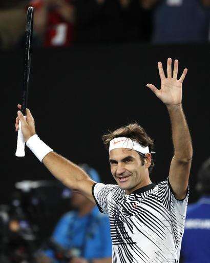 Switzerland's Roger Federer celebrates after defeating Germany's Mischa Zverev during their quarterfinal at the Australian Open tennis championships in Melbourne, Australia, Tuesday, Jan. 24, 2017. (AP Photo/Dita Alangkara) The Associated Press