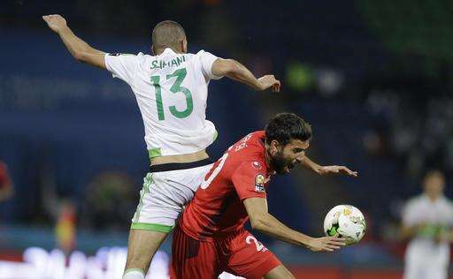 Algeria's, Islam Slimani, left, is challenged by Tunisia's, Mohamed Ali Yacoub during the African Cup of Nations Group B soccer match between Algeria and Tunisia at Stade de Franceville Stadium, in Franceville, Gabon, Thursday Jan. 19, 2017. (AP Photo/Sunday Alamba)