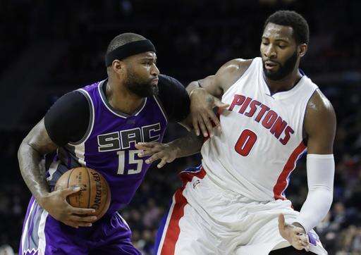 Sacramento Kings forward DeMarcus Cousins (15) runs into Detroit Pistons center Andre Drummond (0) during the first half of an NBA basketball game Monday, Jan. 23, 2017, in Auburn Hills, Mich. (AP Photo/Carlos Osorio) The Associated Press