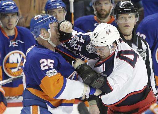 New York Islanders' Jason Chimera (25) fights Columbus Blue Jackets' Lukas Sedlak (45) during the first period of an NHL hockey game, Tuesday, Jan. 24, 2017, in New York. (AP Photo/Frank Franklin II)