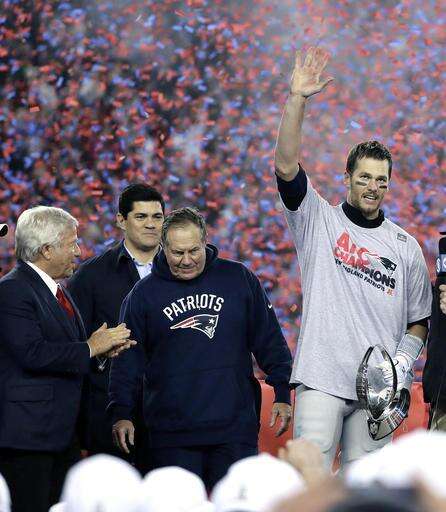 New England Patriots quarterback Tom Brady, right, holds the AFC championship trophy beside team owner Robert Kraft, left, honorary captain Tedy Bruschi, second from left, and head coach Bill Belichick after the AFC championship NFL football game, Sunday, Jan. 22, 2017, in Foxborough, Mass. The New England Patriots defeated the the Pittsburgh Steelers 36-17 to advance to the Super Bowl. (AP Photo/Matt Slocum) The Associated Press