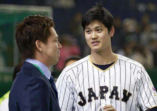 FILE - In this Nov. 10, 2016 file photo, Team Japan pitcher Shohei Otani, right, chats with Los Angeles Dodgers pitcher Kenta Maeda of Japan prior to an international exhibition series baseball game against Mexico at Tokyo Dome in Tokyo. All-Star pitcher Otani will headline Japan's bid for a third title at the World Baseball Classic. The 22-year-old Otani was among 27 players named to Japan's squad on Tuesday, Jan. 24, 2017, by Samurai Japan manager Hiroki Kokubo. (AP Photo/Shizuo Kambayashi, File) The Associated Press
