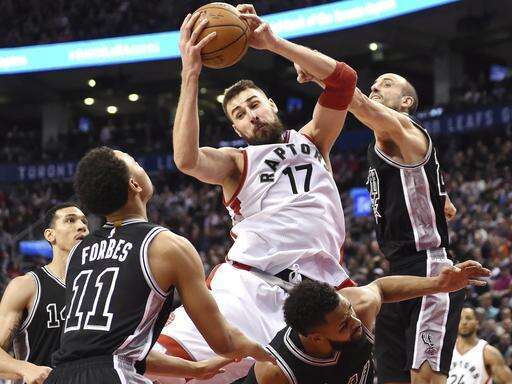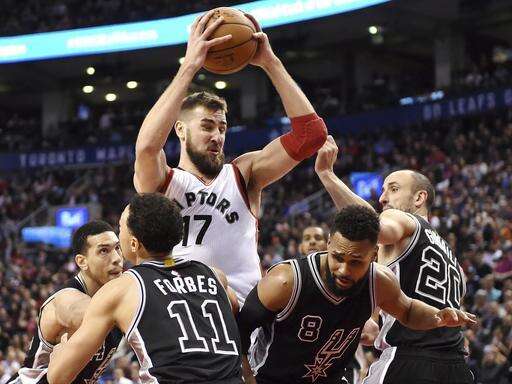 Toronto Raptors center Jonas Valanciunas (17) rebounds over San Antonio Spurs guards Danny Green (14),Bryn Forbes (11), Patty Mills (8) and Manu Ginobili (20) during the second half of an NBA basketball game Tuesday, Jan. 24, 2017, in Toronto. (Frank Gunn/The Canadian Press via AP) The Associated Press