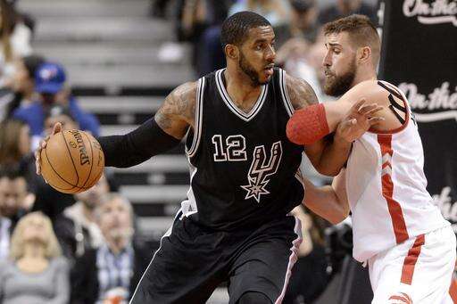 San Antonio Spurs forward LaMarcus Aldridge (12) drives against Toronto Raptors center Jonas Valanciunas (17) during the second half of an NBA basketball game Tuesday, Jan. 24, 2017, in Toronto. (Frank Gunn/The Canadian Press via AP) The Associated Press