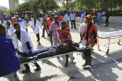 A man who was wounded in a suicide car bomb attack on a hotel is being carried by Somali Red Cross workers and civilians for treatment in Mogadishu, Somalia, Wednesday, Jan 25, 2017. Gunmen from Somalia's violent Islamic extremist rebels fought their way into a hotel in the Somali capital after a suicide car bomb exploded at its gates, a police officer said Wednesday. (AP Photo/Farah Abdi Warsameh)