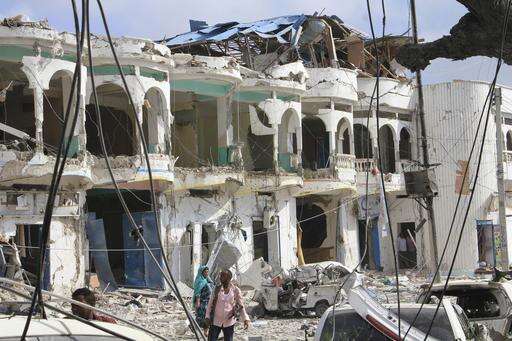 Somalis walk near a hotel heavily damaged by a car bomb blast in Mogadishu, Somalia, Wednesday, Jan 25, 2017. Gunmen from Somalia's violent Islamic extremist rebels fought their way into a hotel in the Somali capital after a suicide car bomb exploded at its gates, a police officer said Wednesday. (AP Photo/Farah Abdi Warsameh)