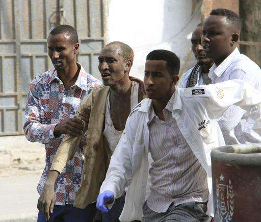 Somali men help a civilian who was wounded in a suicide car bomb attack on a hotel in Mogadishu, Somalia, Wednesday, Jan 25, 2017. Gunmen from Somalia's violent Islamic extremist rebels fought their way into a hotel in the Somali capital after a suicide car bomb exploded at its gates, a police officer said Wednesday. (AP Photo/Farah Abdi Warsameh)