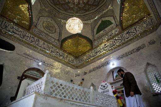 The roof of the shrine shimmers from thousands of tiny inlaid mirrors. A crystal chandelier revolves atop Qadri's marble grave embellished with verses from the Quran.