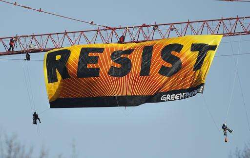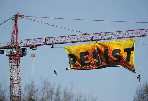 WASHINGTON (AP) - The morning after President Donald Trump issued orders to delay environmental rules and restart pipeline projects, seven Greenpeace protesters climbed a 270-foot tall construction crane blocks from the White House and unfurled a massive orange and yellow banner with the word, "RESIST."