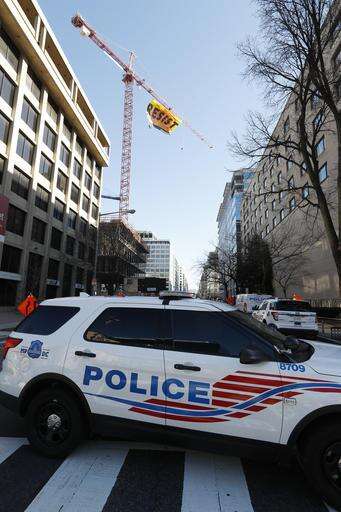 District of Columbia police took a hands-off approach while the protesters suspended themselves from harnesses and ropes below the crane's huge arm. Police closed three city blocks to traffic and appeared content to wait until they climbed down to be arrested.