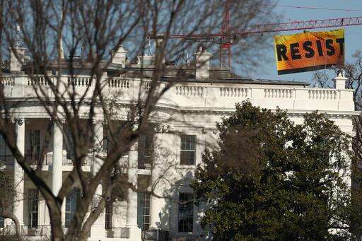 The banner encouraging opposition to Trump's agenda was clearly visible from the grounds of the White House for several hours on Wednesday, and from some angles it appeared to hover over the building. Protesters hoped it would get under his skin.