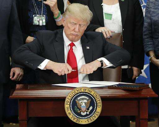 President Donald Trump takes the cap off a pen before signing executive order for immigration actions to build border wall during a visit to the Homeland Security Department in Washington, Wednesday, Jan. 25, 2017. (AP Photo/Pablo Martinez Monsivais) The Associated Press