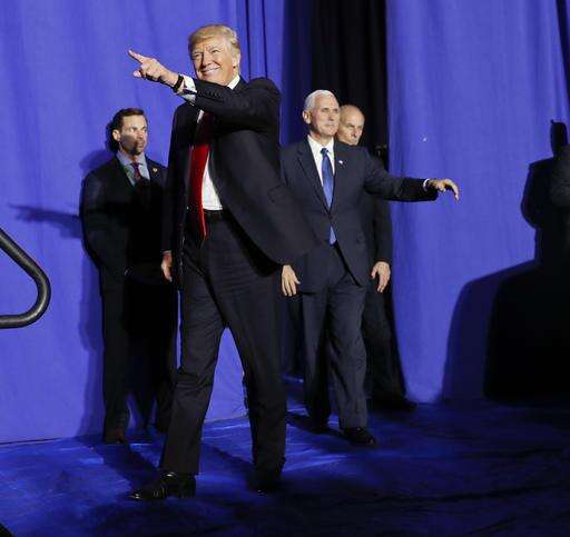 President Donald Trump, accompanied by Vice President Mike Pence, center, and Homeland Security Secretary John F. Kelly, right, gestures as he is introduced before speaking at the Homeland Security Department in Washington, Wednesday, Jan. 25, 2017. (AP Photo/Pablo Martinez Monsivais) The Associated Press