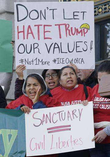 Protesters hold signs as they yell at a rally outside of City Hall in San Francisco, Wednesday, Jan. 25, 2017. President Donald Trump moved aggressively to tighten the nation's immigration controls Wednesday, signing executive actions to jumpstart construction of his promised U.S.-Mexico border wall and cut federal grants for immigrant-protecting "sanctuary cities." (AP Photo/Jeff Chiu) The Associated Press