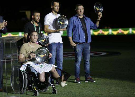 Former Chapecoense goalkeeper Follmann, in wheelchair, and Alan Ruschel, behind him, greet Brazils' soccer players prior to a friendly match with Colombia at the Nilton Santos stadium, in Rio de Janeiro, Brazil, Wednesday, Jan 25, 2017. The match is a tribute to Chapecoense soccer players who died in a plane crash in Colombia last November. Follmann and Ruschel survived the crash. (AP Photo/Silvia Izquierdo)