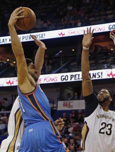 Oklahoma City Thunder center Enes Kanter, left, is fouled by New Orleans Pelicans center Omer Asik, behind, as forward Anthony Davis (23) also defends as Kanter tried to dunk in the first half of an NBA basketball game in New Orleans, Wednesday, Jan. 25, 2017. (AP Photo/Max Becherer) The Associated Press