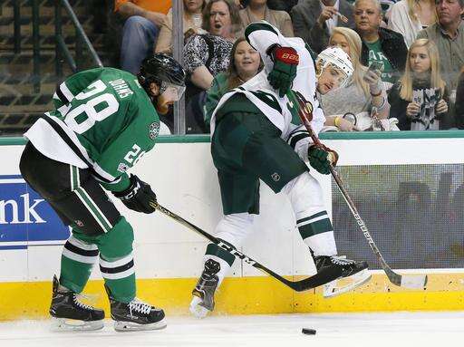Minnesota took a 1-0 lead with 6:25 left in the first period. Dallas' Patrick Sharp shot wide, and the puck bounced hard off the boards almost to the blue line. Pominville picked up the puck, skated in 2-on-1 with Erik Haula and fired a wrist shot inside Lehtonen to the upper right corner of the net.