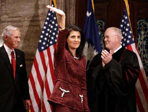 Former South Carolina Governor and current ambassador to the United Nations, Nikki Haley, in middle, waves to the crowd after current Governor Henry McMaster, at left, was sworn in by S.C. Chief Justice Don Beatty during a ceremonial swearing in at the Statehouse Tuesday Jan. 24, 2017, in Columbia, S.C. Haley resigned as governor after she became ambassador to the United Nations. (AP Photo/Mic Smith) The Associated Press