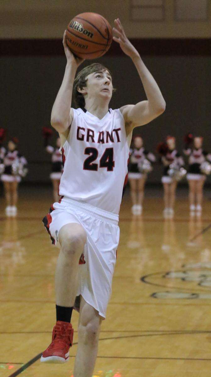 Grant's Kyle Dupree celebrates a first-quarter three point shot at the buzzer.