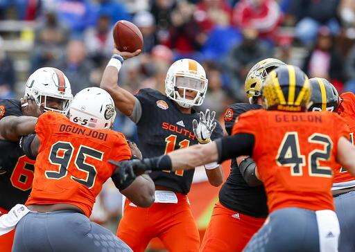 Nate Peterman of Pittsburgh had a similarly strong passing performance for the North in the showcase game for senior NFL prospects that actually featured late drama. Peterman fired a 6-yard scoring pass to East Carolina's Zay Jones with 1:51 left but the North went for two points and a potential lead.