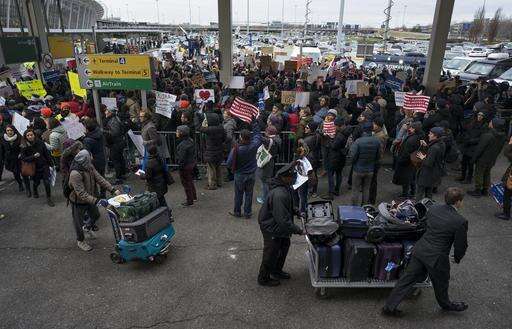 Protests broke out at several U.S. airports where travelers were being detained, including a gathering of several hundred people outside San Francisco's main airport and a raucous demonstration of at least 2,000 people at New York's Kennedy International Airport.
