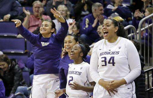Players on the Washington bench cheer a 3-point basket by Natalie Romeo against California during the first half of an NCAA college basketball game Friday, Jan. 27, 2017, in Seattle. (AP Photo/Elaine Thompson) The Associated Press