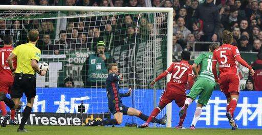 Werder Bremen's Max Kruse, right, scores against Bayern goalkeeper Manuel Neuer during the German Bundesliga soccer match between Werder Bremen and Bayern Munich in Bremen, Saturday, Jan. 28, 2017. (AP Photo/Martin Meissner) The Associated Press