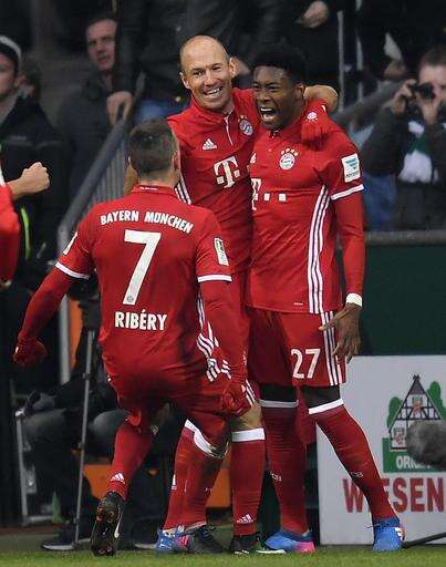 Bayern's David Alaba, right, celebrates his free kick goal with first scorer Arjen Robben, center, and Bayern's Franck Ribery during the German Bundesliga soccer match between Werder Bremen and Bayern Munich in Bremen, Saturday, Jan. 28, 2017. (AP Photo/Martin Meissner) The Associated Press