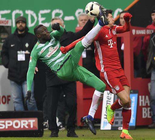 Werder Bremen's Lamine Sane, left, and Bayern's Robert Lewandowski challenge for the ball during the German Bundesliga soccer match between Werder Bremen and Bayern Munich in Bremen, Saturday, Jan. 28, 2017. (AP Photo/Martin Meissner) The Associated Press