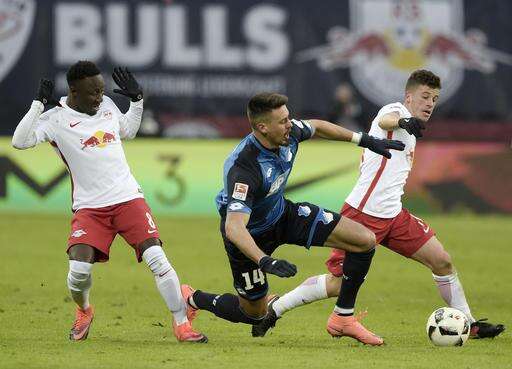 Hoffenheim's Sandro Wagner, center, challenges for the ball with Leipzig's Diego Demme, right, besides Leipzig's Naby Keita, left, during the German first division Bundesliga soccer match between RB Leipzig and TSG 1899 Hoffenheim in Leipzig, Germany, Saturday, Jan. 28, 2017. (AP Photo/Jens Meyer) The Associated Press