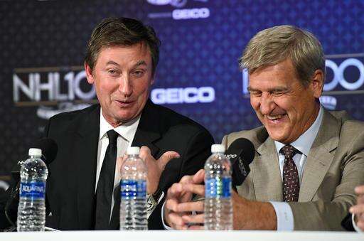 Wayne Gretzky, left, points to Bobby Orr during a news conference prior to an NHL 100 ceremony, Friday, Jan. 27, 2017, in Los Angeles. (AP Photo/Mark J. Terrill) The Associated Press