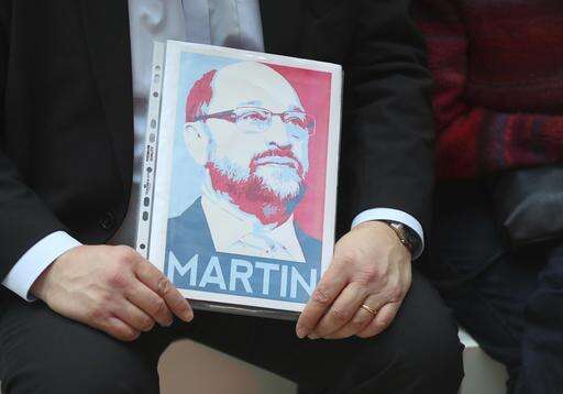 A supporter of the German Social Democratic Party, SPD, holds a picture of former President of the European Parliament Martin Schulz while waiting for a news conference at the party's headquarters in Berlin, Germany, Sunday, Jan. 29, 2017. Members of the SPD's national executive agreed Sunday to make Schulz their candidate for the chancellorship, a post that traditionally goes to the party which receives the greatest share of votes in a general election. (Kay Nietfeld/dpa via AP)