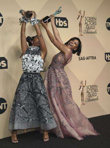Janelle Monae, left, and Taraji P. Henson pose in the press room with the award for outstanding performance by a cast in a motion picture for "Hidden Figures" at the 23rd annual Screen Actors Guild Awards at the Shrine Auditorium & Expo Hall on Sunday, Jan. 29, 2017, in Los Angeles. (Photo by Jordan Strauss/Invision/AP)