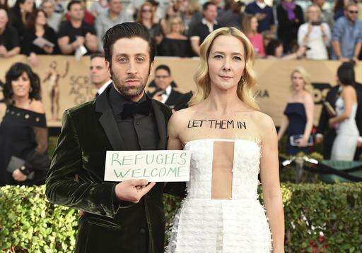 Simon Helberg, left, and Jocelyn Towne display protest signs against the U.S. policy of temporarily barring refugees and citizens of seven predominantly Muslim countries, at the 23rd annual Screen Actors Guild Awards at the Shrine Auditorium & Expo Hall on Sunday, Jan. 29, 2017, in Los Angeles. (Photo by Jordan Strauss/Invision/AP)