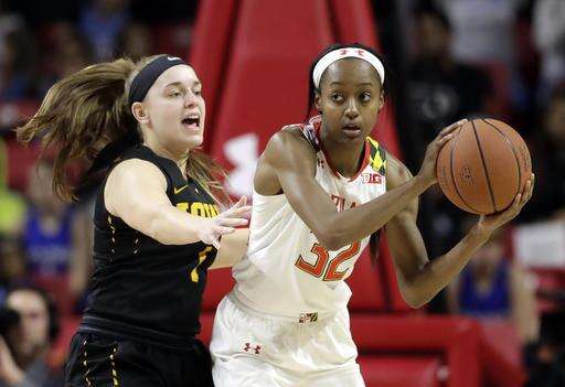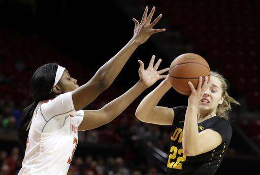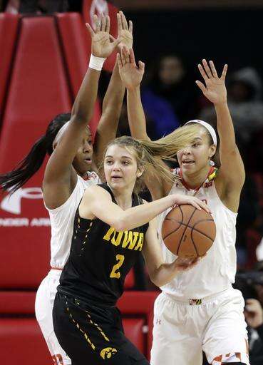 Iowa guard Kathleen Doyle, right, tries to maintain possession as she is pressured by Maryland forward Brianna Fraser in the first half of an NCAA college basketball game, Sunday, Jan. 29, 2017, in College Park, Md. (AP Photo/Patrick Semansky) The Associated Press