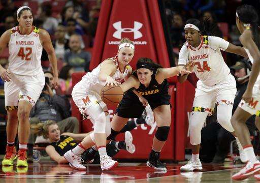 Maryland guard Kristen Confroy, center left, grabs the ball in front of Iowa forward Megan Gustafson, center, right, as Maryland's Brionna Jones (42) and Brianna Fraser (34) look on in the second half of an NCAA college basketball game, Sunday, Jan. 29, 2017, in College Park, Md. (AP Photo/Patrick Semansky) The Associated Press
