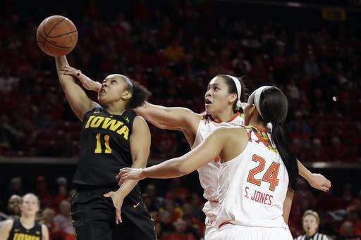 Iowa guard Tania Davis, left, is fouled by Maryland center Brionna Jones, center, as she shoots against Jones and Maryland forward Stephanie Jones (24) in the first half of an NCAA college basketball game, Sunday, Jan. 29, 2017, in College Park, Md. (AP Photo/Patrick Semansky) The Associated Press