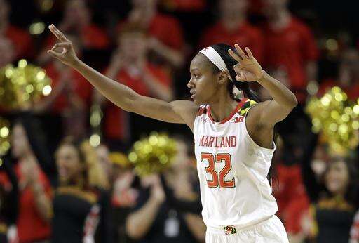 Maryland guard Shatori Walker-Kimbrough gestures after making a three-point basket the first half of an NCAA college basketball game against Iowa, Sunday, Jan. 29, 2017, in College Park, Md. (AP Photo/Patrick Semansky) The Associated Press