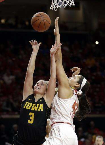 Iowa guard Makenzie Meyer, left, shoots against Maryland center Brionna Jones in the first half of an NCAA college basketball game, Sunday, Jan. 29, 2017, in College Park, Md. (AP Photo/Patrick Semansky) The Associated Press