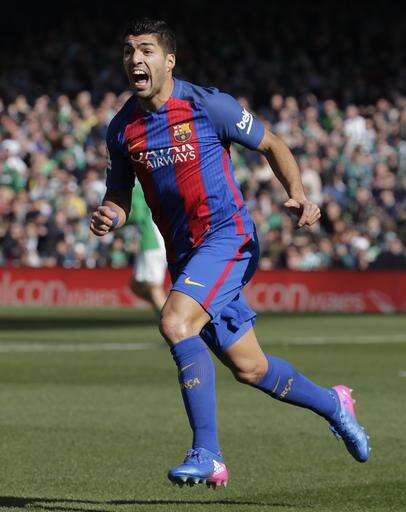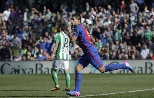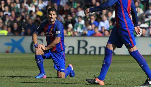 Second-placed Barcelona needed a late equalizer by Luis Suarez to draw at Real Betis 1-1, while 10-man Sevilla lost 3-1 at Espanyol.