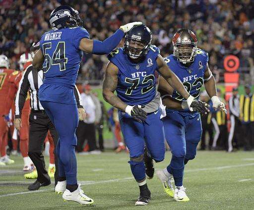 NFC linebacker Bobby Wagner (54), of the Seattle Seahawks congratulates defensive end Michael Bennett (72), of the Seattle Seahawks, after Bennett sacked AFC quarterback Andy Dalton (14), of the Cincinnati Bengals, during the first half of the NFL Pro Bowl football game Sunday, Jan. 29, 2017, in Orlando, Fla. To the right is NFC interior lineman Gerald McCoy (93), of the Tampa Bay Buccaneers. (AP Photo/Phelan M Ebenhack) The Associated Press