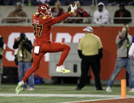 AFC tight end Travis Kelce (87), of the Kansas City Chiefs, jumps into the enzone for a touchdown, during the first half of the NFL Pro Bowl football game Sunday, Jan. 29, 2017, in Orlando, Fla. (AP Photo/Chris O'Meara) The Associated Press